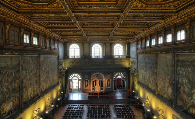 大厅长53米,宽22米,达·芬奇受邀创作《安吉里之役》,而米开朗基罗则被委托创作《卡西纳之战》。