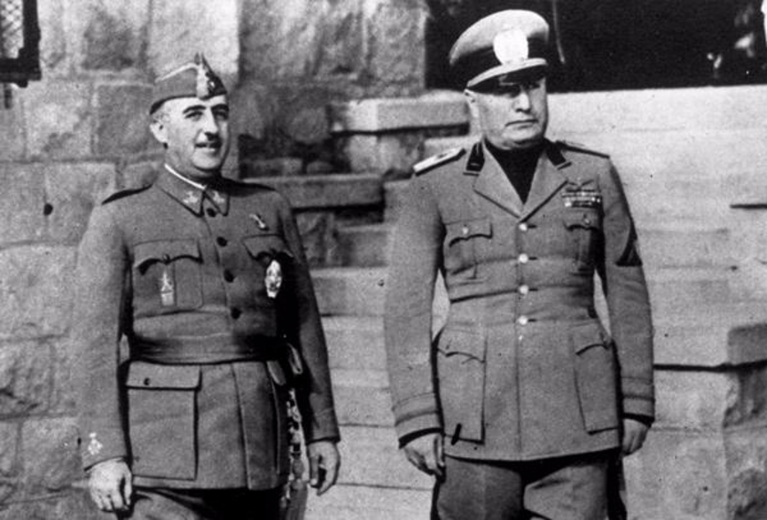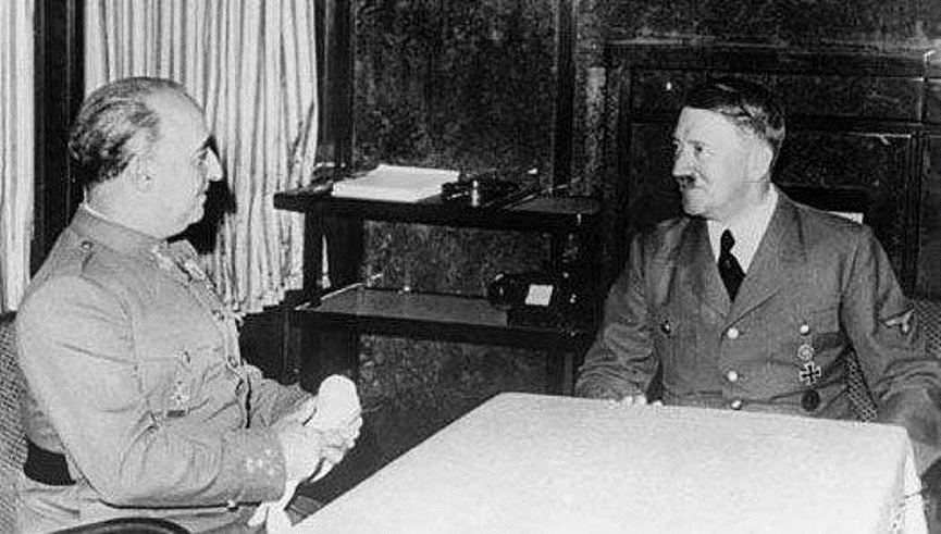 在二战时期,希特勒和墨索里尼多次要求西班牙加入战争,但是佛朗哥一直以西班牙要休养生息为理由,加以拒绝。