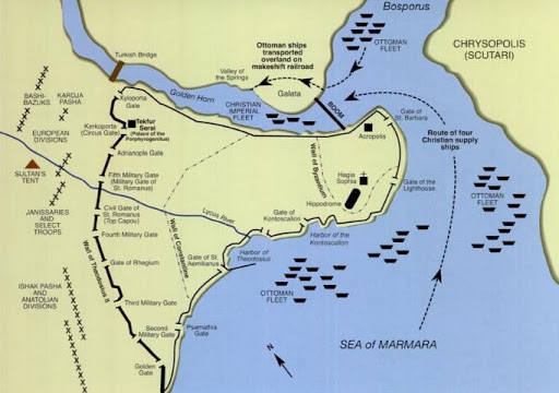 君士坦丁堡是巴尔干半岛东部突入大海的一块海岬,三面临水。东临斯普鲁斯海峡,南面马尔马拉海,北面金角湾。其中,靠近博斯普鲁斯海峡一带,海岸线短而曲折,地势陡峭,难于攀登;南面的马尔马拉海,水流湍急,风急浪大,船只都极难停稳,更不要说登陆了;只有北面的金角湾是天然良港,适宜船只停泊和军队登陆,但拜入口处横跨海面的铁链所赐,奥斯曼帝国舰队根本进不去。唯一与陆地连接的西面,有绵延数十公里的防御城墙,外墙最高处可达20米,内墙与外墙之间又有宽20米的护城河。在冷兵器时代,这样一堵墙就是无法逾越的屏障,这也是君士坦丁堡屡遭围攻而不破的关键所在。