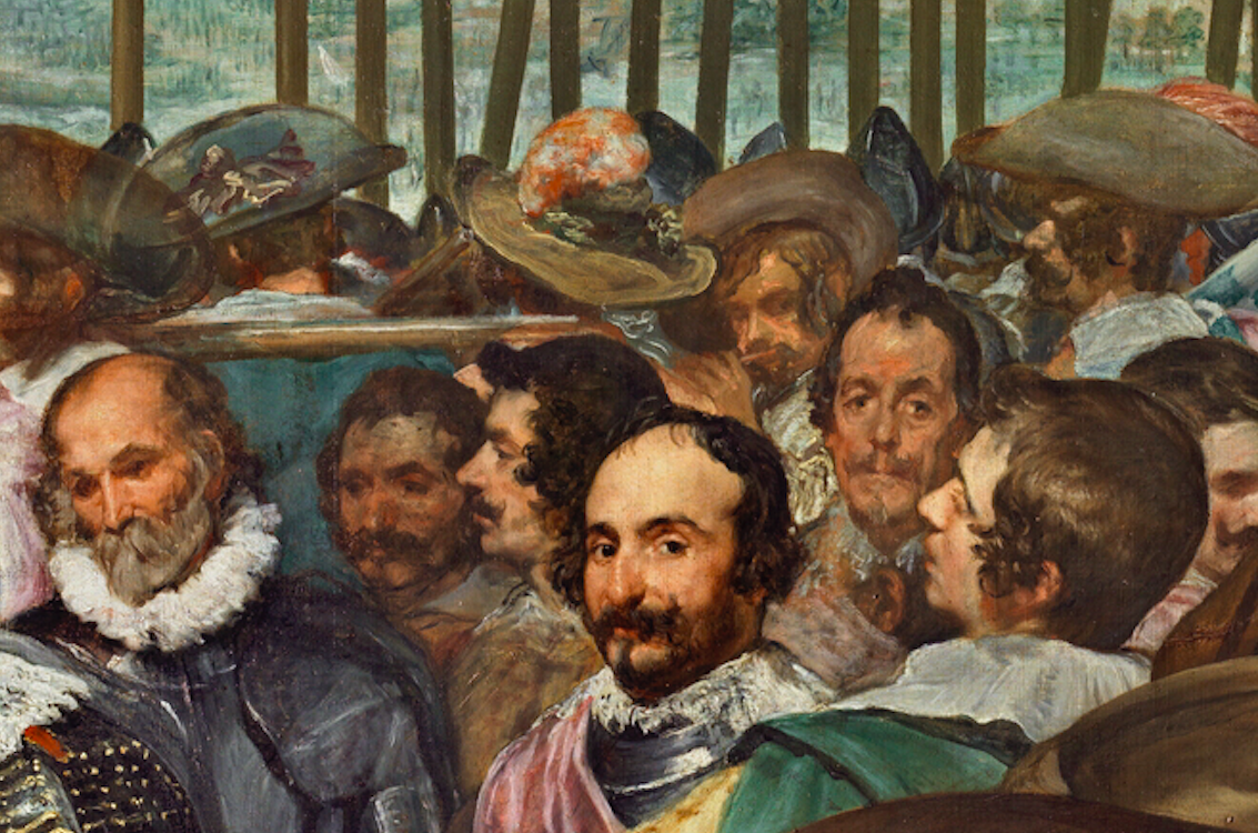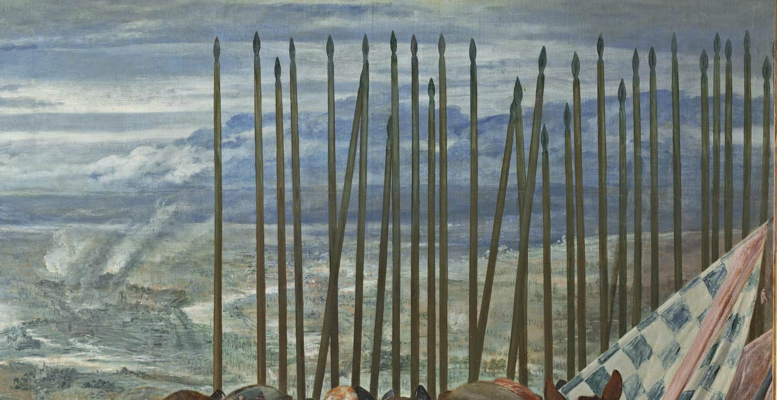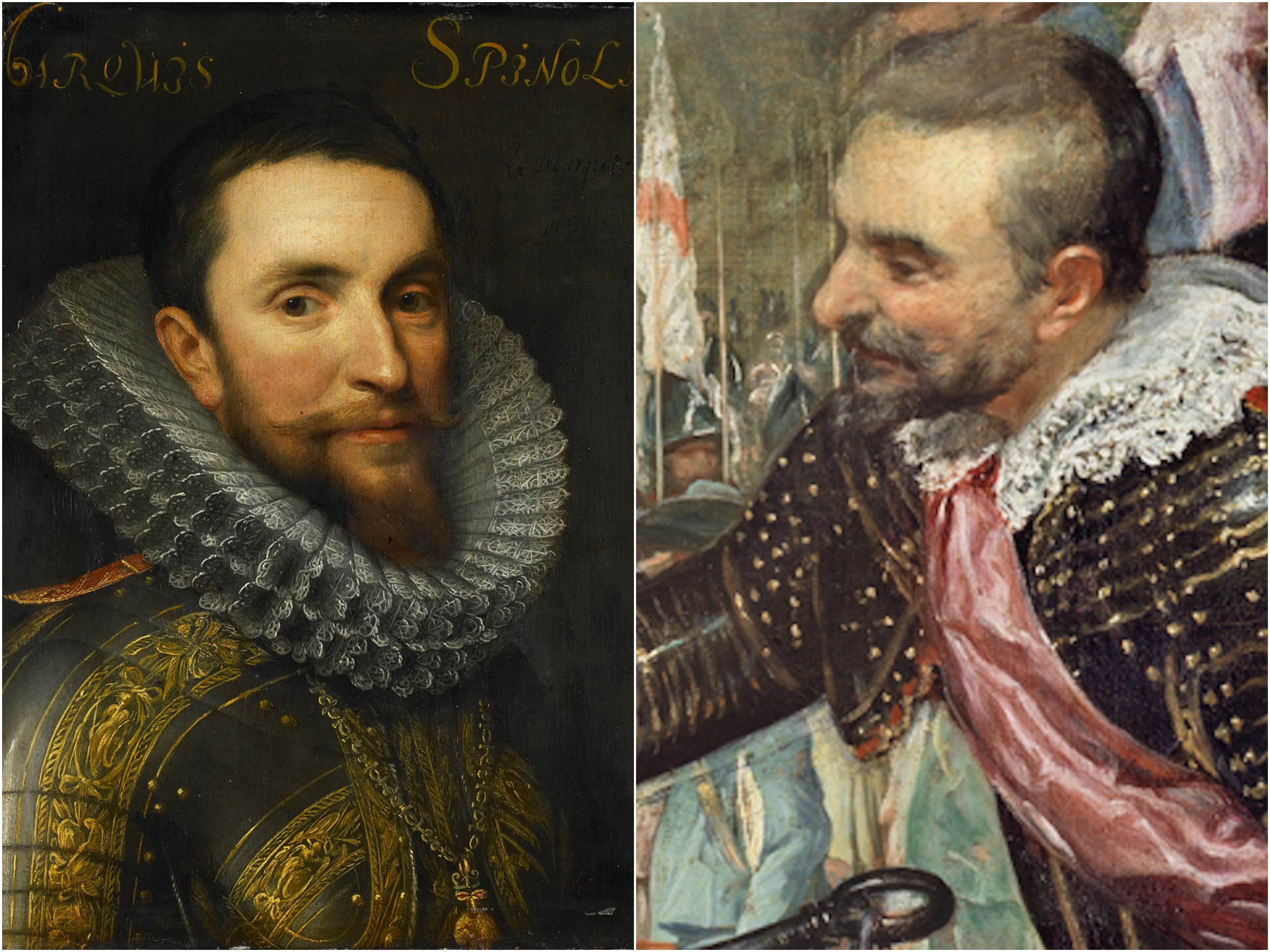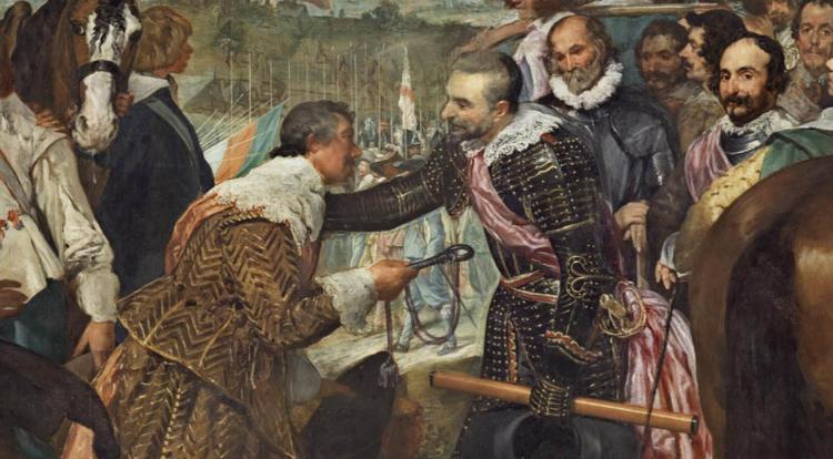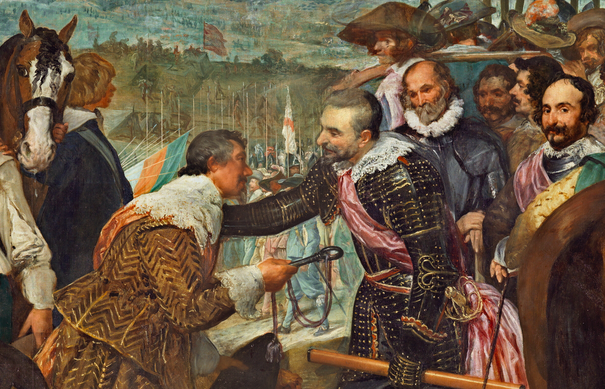 画中两位将军,左边的贾斯丁·凡·纳索躬身手持布雷达城的钥匙,恭敬地献给西班牙公爵安柏吉奥·斯皮诺拉。
