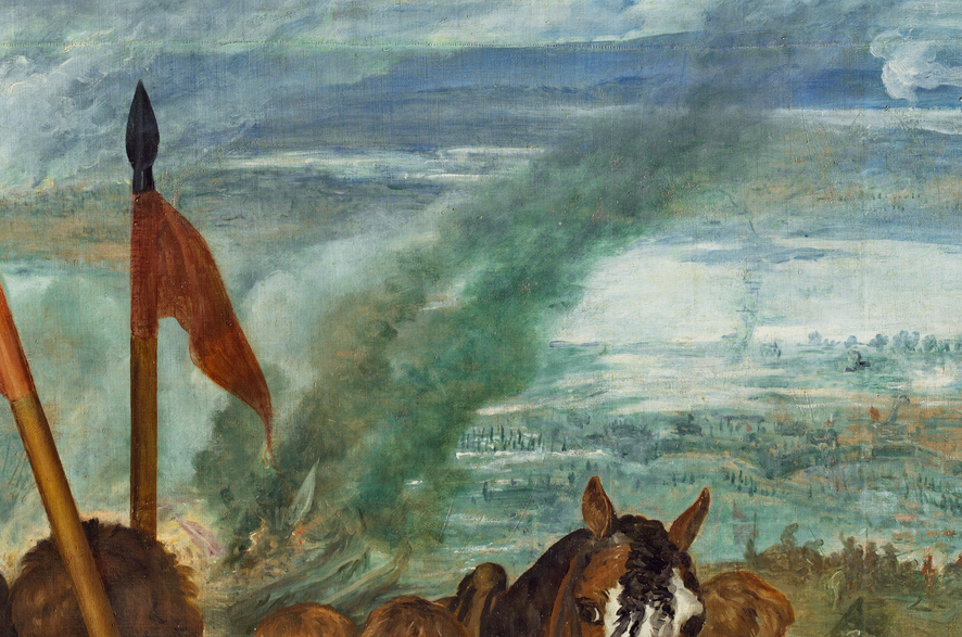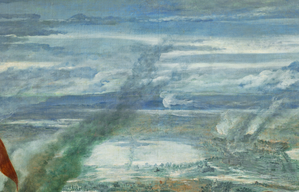 远方背景开阔,硝烟弥漫着从左侧荷兰军队的身后升起,象征着他们失败。