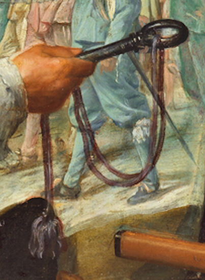 于此同时,面带笑容的西班牙军队,数量众多的标枪林立、整齐威严;而荷兰军队队列稀少、凌乱松散、面色迷茫。两者形成鲜明的的对比。